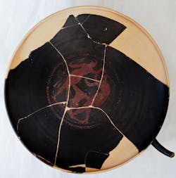 La kylix è stata rinvenuta assieme ad altri materiali, all'interno di un piccolo nucleo funerario nei pressi di Porta S.Marco (Siena, SI), con tombe probabilmente di età tardo-orientalizzante, arcaica, ellenistica. Datata al IV sec. a.C., è caratterizzata da un sostegno cilindrico e piede trombiforme, mentre l’attacco dell’ansa è di tipo a bastoncello. La decorazione sovradipinta in rosso è affidata ad una scena posta nel tondo interno reso con una cornice a treccia, in cui un satiro dalla lunga barba cerca di ghernire una menade, assieme a loro un cratere a calice e un tirso. Le anse sono esternamente decorate da un motivo vegetale di palmetta.